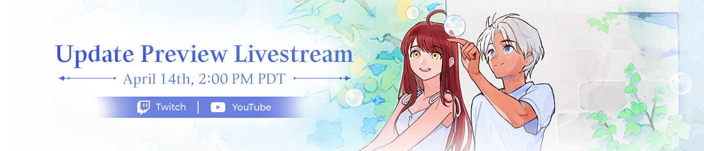 Join Community Managers Arciellia and Elebon as they go over the details of the next update including the inclusion of additional Stat Gear, Debuff Changes, more Quality of Life changes, new events, sales, and more! Join us on our Twitch and YouTube channels, Tuesday, April 14th at 2:00 PM PDT (5:00 PM EDT). As always, there will be giveaways throughout the stream!