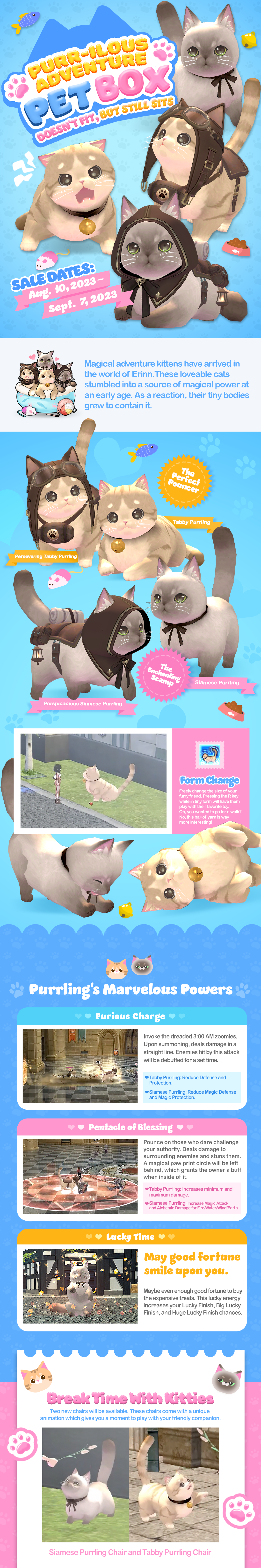 - Siamese Purrling Pets will grant an increase in Magic Attack base +25 and +2 per 1,000 levels. The Alchemic Damage will increase for Fire/Water/Wind/Earth base +10 and +1 every 1,000 cumulative levels.