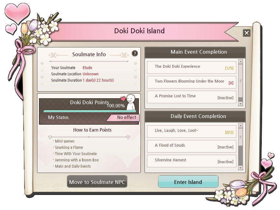 They say true love can’t be measured, but it can on Doki Doki Island! You’ll be able to earn Doki Doki Points through all of the activities that the island has to offer! If you’re ever unsure of how far along you are, you can check the status through your Soulmate window!
