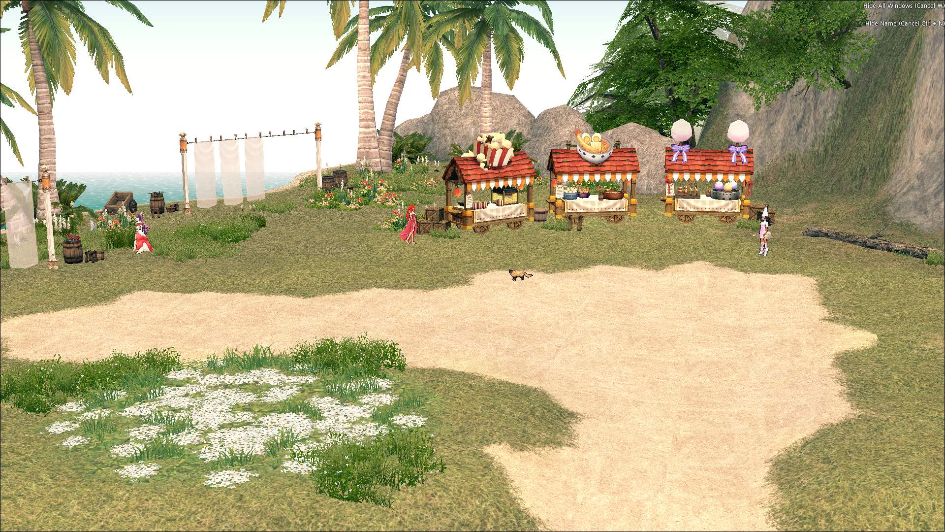 Down towards the west side of the island, you’ll notice a small market where they sell some of the best food in all of Erinn! Whether it’s the Doki Doki Steak or the Doki Doki Sweet Dessert, your taste buds will be in love with these unique treats from the Doki Doki Restaurant. A restaurant this popular is always looking for help… check with Chef Maisie for more details if you’re looking to set foot into the restaurant business! If you're more for fashion and colors, check out the Floral Dyeing later on in the event. Otherwise, sun-tanning chairs have been set up all along the beach nearby for those that prefer to do a little cooking on themselves.